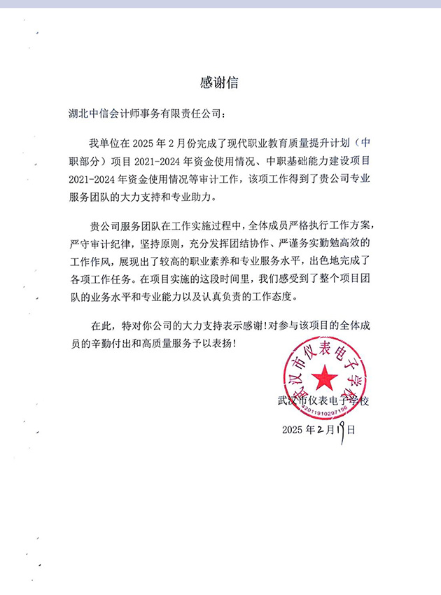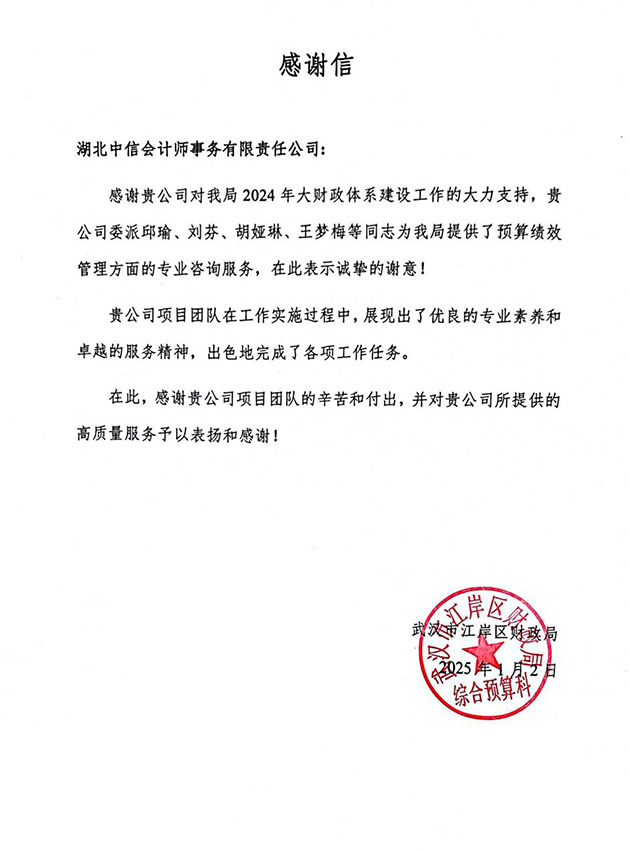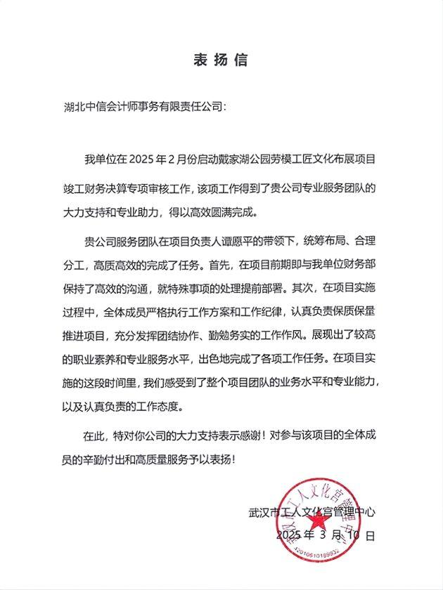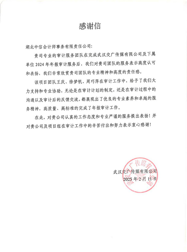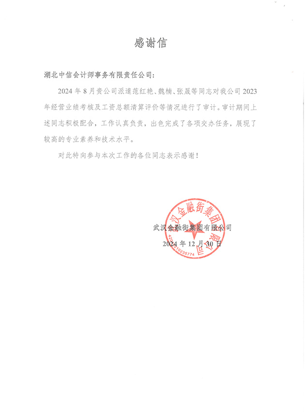 武漢城市建設(shè)集團(tuán)有限公司人力資源部感謝信