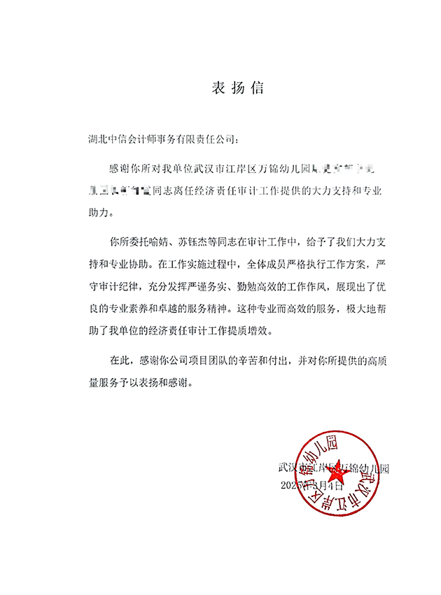 武漢市江岸區(qū)萬錦幼兒園表揚(yáng)信