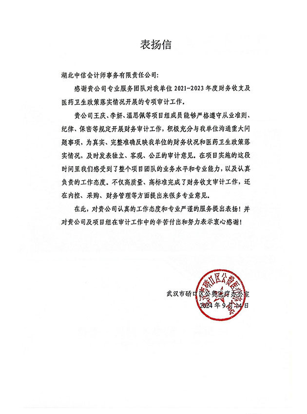 武漢市硚口區(qū)公費(fèi)醫(yī)療辦公室表揚(yáng)信