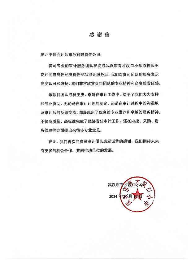 武漢市育才漢口小學(xué)感謝信
