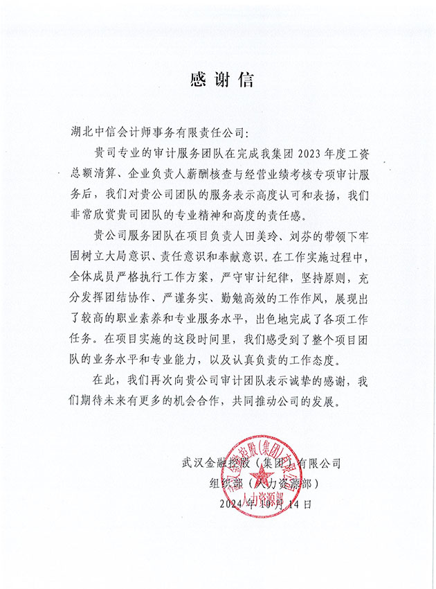 武漢金融控股(集團(tuán))有限公司組織部感謝信