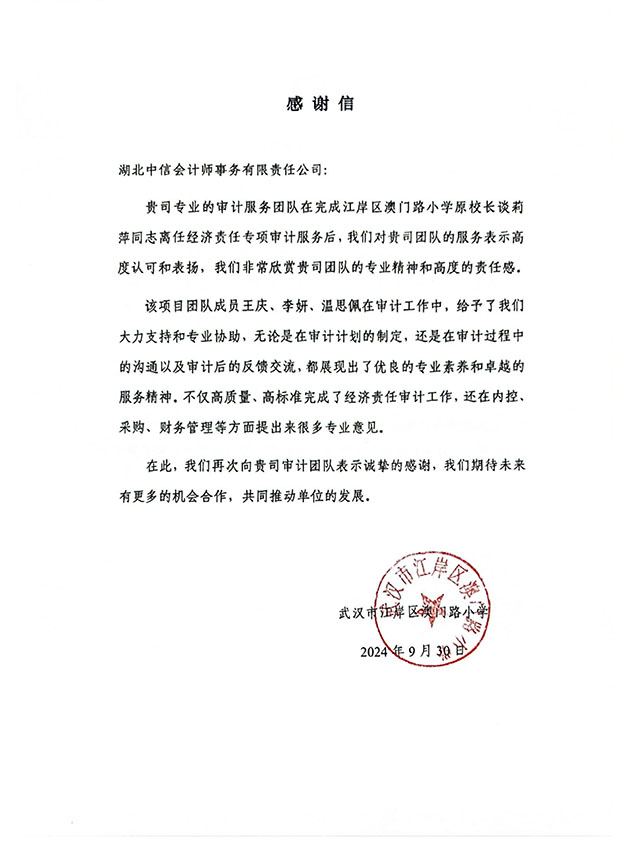 武漢市江岸區(qū)澳門路小學(xué)感謝信
