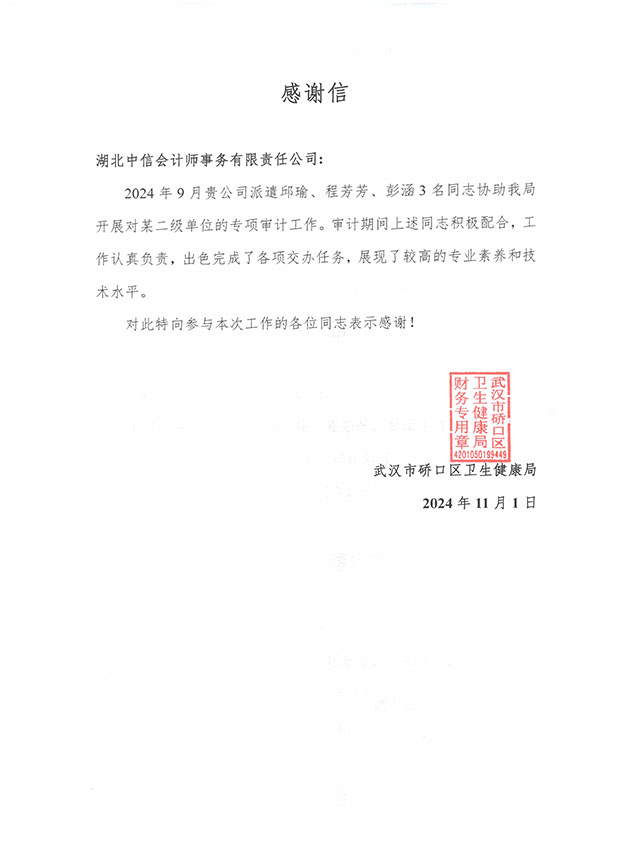 武漢市硚口衛(wèi)生健康局感謝信