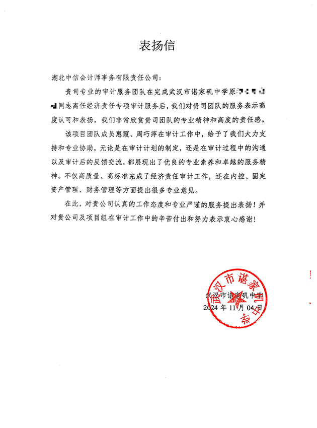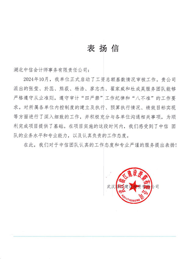武漢臨江建設(shè)投資有限公司表揚(yáng)信