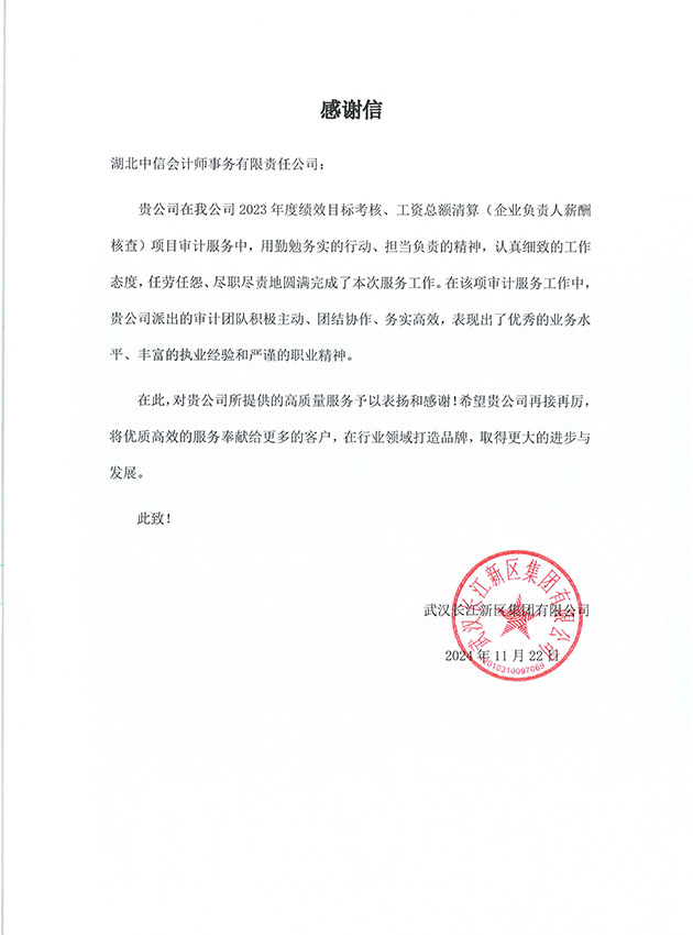武漢長江新區(qū)集團(tuán)有限公司感謝信