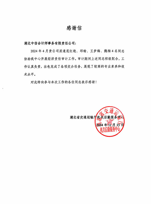湖北省交通運(yùn)輸廳機(jī)關(guān)后期服務(wù)中心感謝信