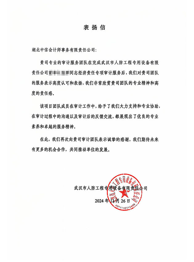 武漢市人防工程專用設(shè)備有限責(zé)任公司表揚(yáng)信