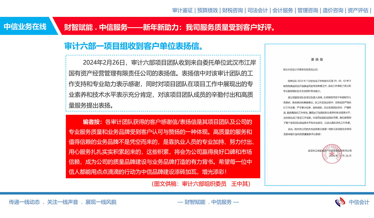 審計(jì)六部一項(xiàng)目組收到客戶單位表?yè)P(yáng)信