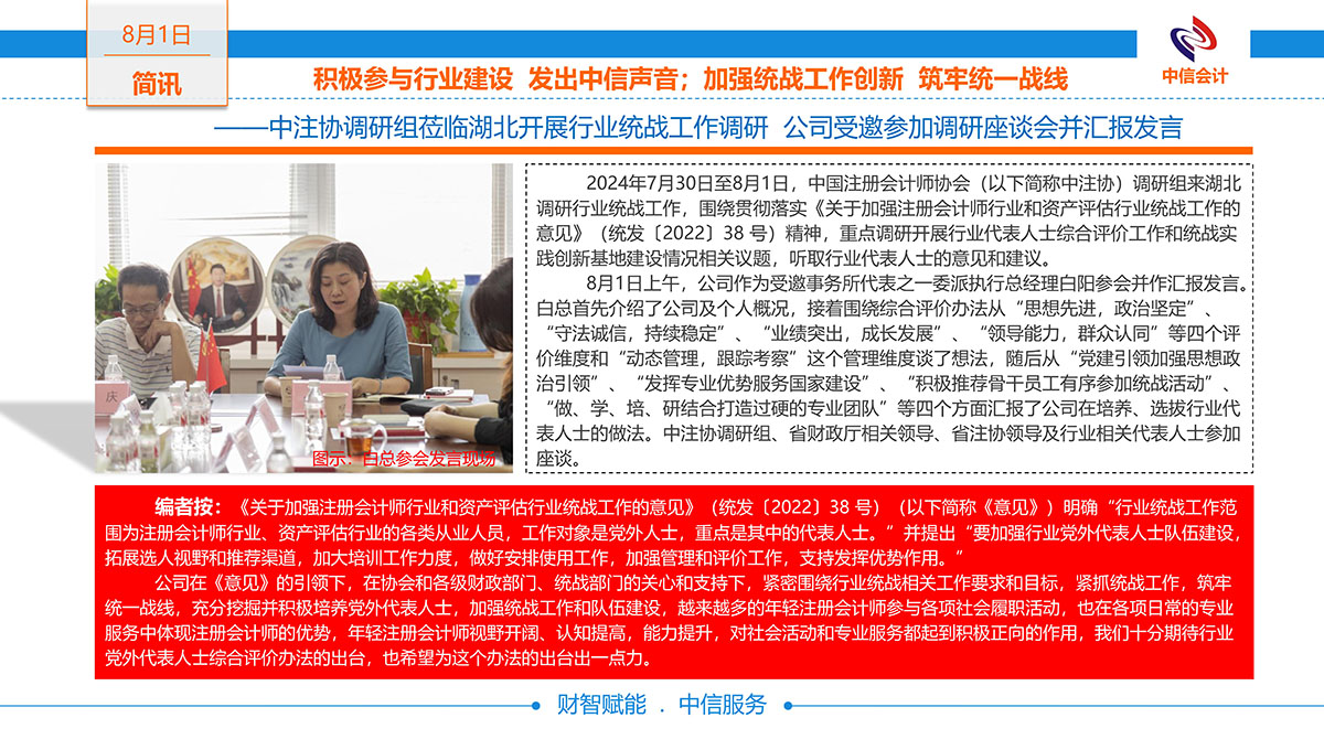 ——中注協(xié)調(diào)研組蒞臨湖北開(kāi)展行業(yè)統(tǒng)戰(zhàn)工作調(diào)研,公司受邀參加調(diào)研座談會(huì)并匯報(bào)發(fā)言 -