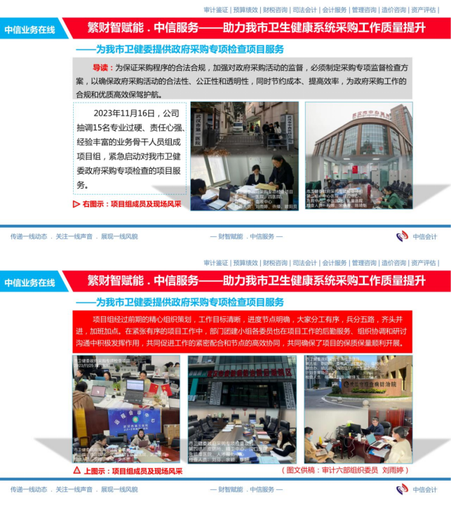 2023年11月16日,中信會(huì)計(jì)公司抽調(diào)專業(yè)過硬、責(zé)任心強(qiáng)、經(jīng)驗(yàn)豐富的業(yè)務(wù)骨干人員組成項(xiàng)目組,為我市衛(wèi)健委提供政府采購專項(xiàng)檢查項(xiàng)目服務(wù)。