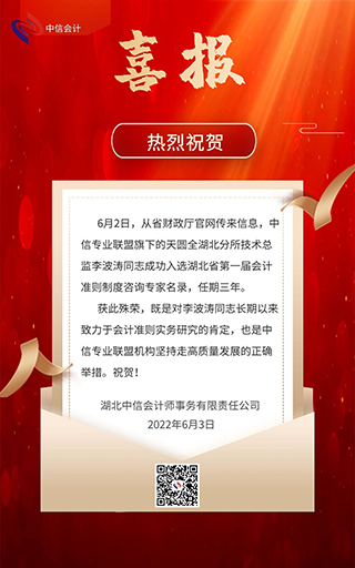 喜報:李波濤同志成功入選湖北省第一屆會計準(zhǔn)則制度咨詢專家名錄