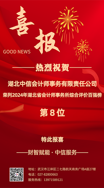 12月17日從湖北省注冊會計師行業(yè)協(xié)會官方網(wǎng)站發(fā)布的《湖北省2024年會計師事務(wù)所綜合評價前百家信息》的通告中獲悉,在全體中信同仁的共同努力拼搏下,湖北中信會計師事務(wù)所在湖北省2024年會計師事務(wù)所綜合評價前百強排名中位列第8位,在2023年排名基礎(chǔ)上再進二位。
