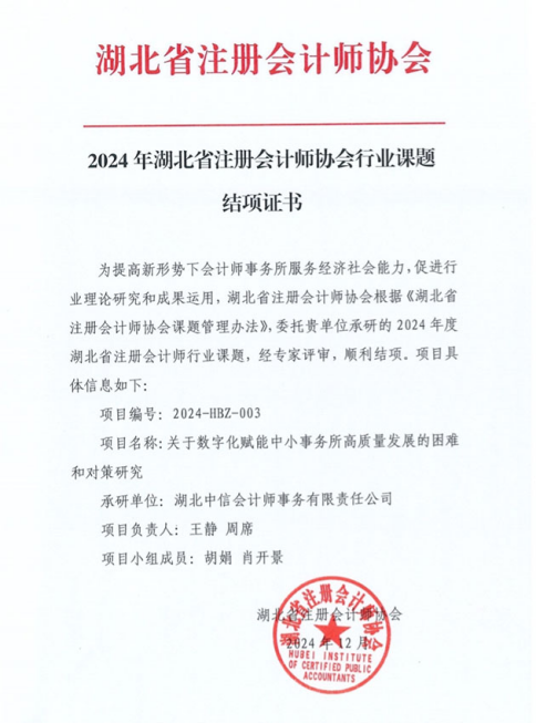 湖北中信會(huì)計(jì)師事務(wù)所承研的2024年湖北省注冊(cè)會(huì)計(jì)師協(xié)會(huì)行業(yè)課題順利結(jié)項(xiàng)