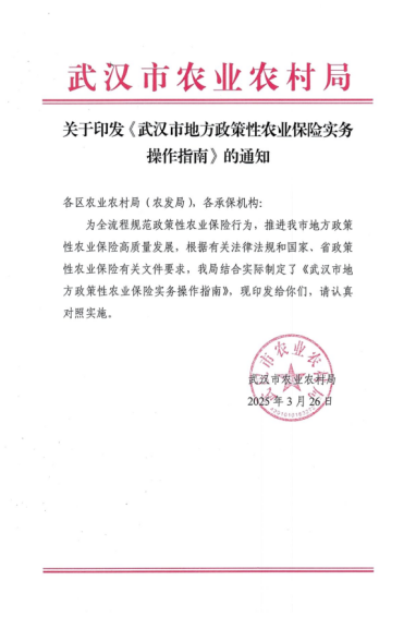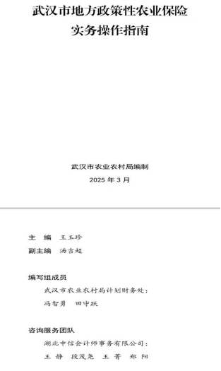 由武漢市農(nóng)業(yè)農(nóng)村局組織編制、湖北中信會(huì)計(jì)師事務(wù)所協(xié)助編制完成的《武漢市地方政策性農(nóng)業(yè)保險(xiǎn)實(shí)務(wù)操作指南》(以下簡(jiǎn)稱《操作指南》)正式印發(fā)。該《操作指南》不僅系武漢市政策性農(nóng)業(yè)保險(xiǎn)實(shí)務(wù)首本操作指南,在全國(guó)也屬首創(chuàng),對(duì)我市貫徹落實(shí)國(guó)家及省市關(guān)于加快農(nóng)業(yè)保險(xiǎn)高質(zhì)量發(fā)展及支持農(nóng)業(yè)農(nóng)村發(fā)展相關(guān)文件要求,提高金融支持農(nóng)業(yè)農(nóng)村發(fā)展能力,提升地方政策性農(nóng)業(yè)保險(xiǎn)保障水平,預(yù)防和控制政策性農(nóng)業(yè)保險(xiǎn)項(xiàng)目面臨的各類風(fēng)險(xiǎn),完善和規(guī)范政策性農(nóng)業(yè)保險(xiǎn)服務(wù)工作具有重要意義并將發(fā)揮重大積極作用。