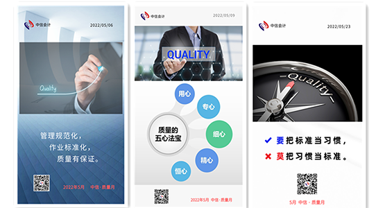 為宣導(dǎo)質(zhì)量理念,宣傳質(zhì)量意識,提高質(zhì)量認(rèn)知,圍繞質(zhì)量月主題,公司制作宣傳海報并利用“中信晨話”平臺,定期推送,營造人人講質(zhì)量,人人抓質(zhì)量,人人重質(zhì)量的風(fēng)氣,使“質(zhì)量至上”理念深入人心,并落實到行動中。