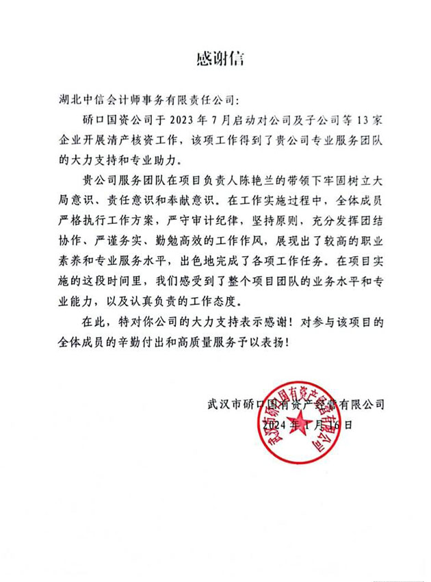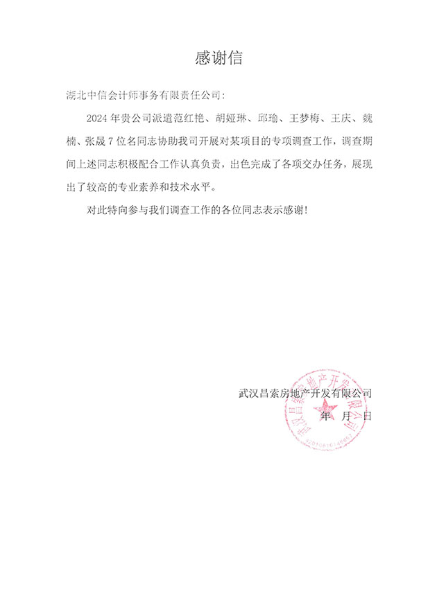 武漢昌索房地產(chǎn)開(kāi)發(fā)有限公司專項(xiàng)調(diào)查項(xiàng)目感謝信