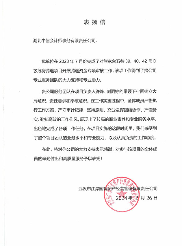武漢市江岸國(guó)資公司表?yè)P(yáng)信