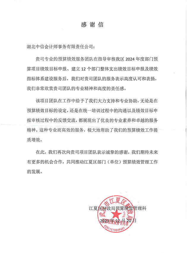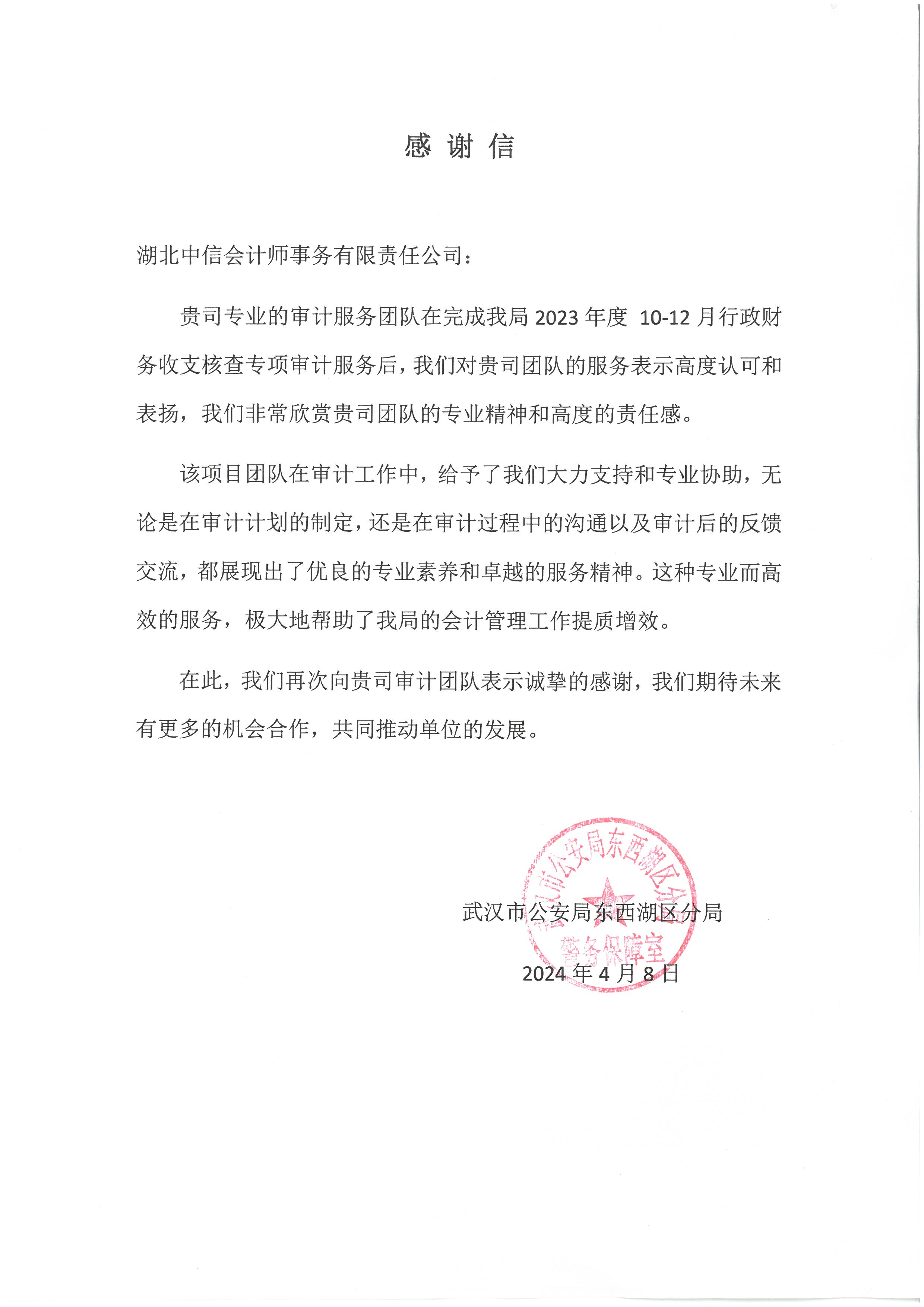 武漢市公安局東西湖區(qū)分局財(cái)務(wù)收支核查專項(xiàng)審計(jì)感謝信