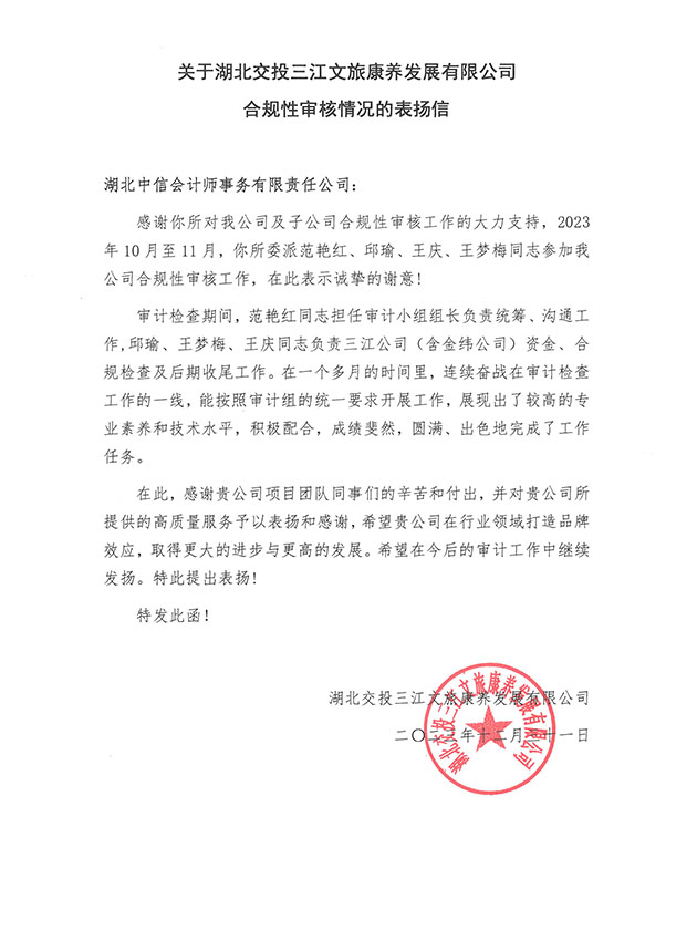 湖北三江文旅康養(yǎng)發(fā)展有限公司合規(guī)性審核項(xiàng)目表?yè)P(yáng)信