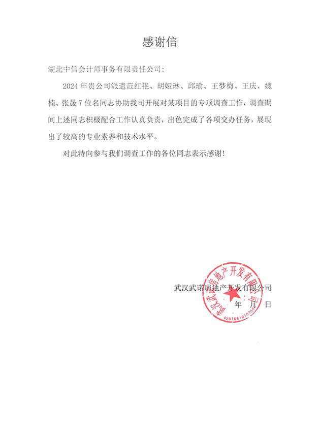 武漢武諾房地產(chǎn)開(kāi)發(fā)有限公司專項(xiàng)調(diào)查項(xiàng)目感謝信