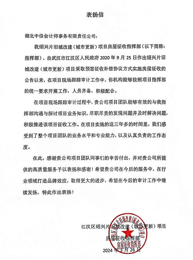江漢區(qū)紹興片舊城改建項(xiàng)目表?yè)P(yáng)信