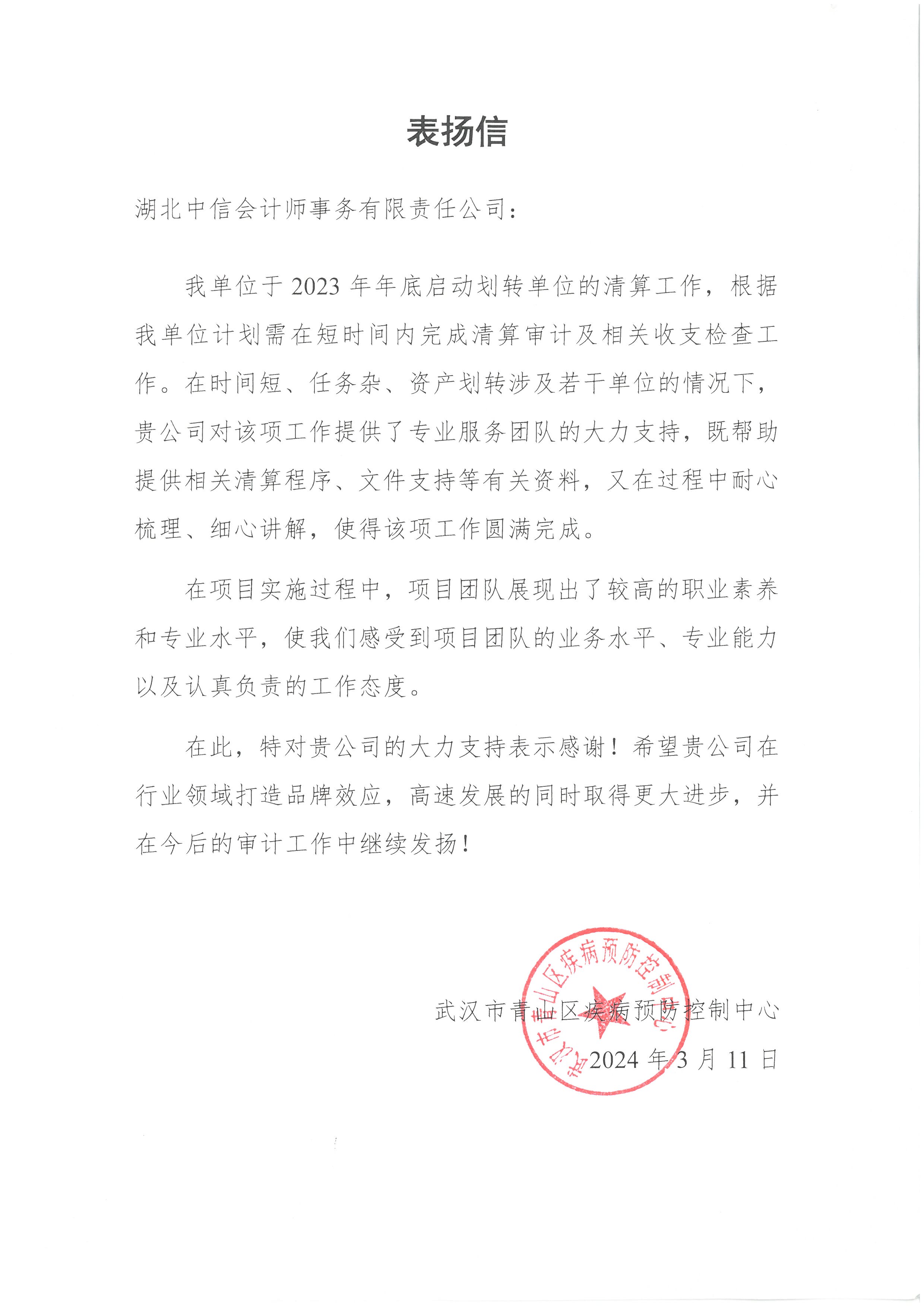 青山區(qū)疫病預(yù)防控制中心清算審計(jì)及收支檢查項(xiàng)目表?yè)P(yáng)信