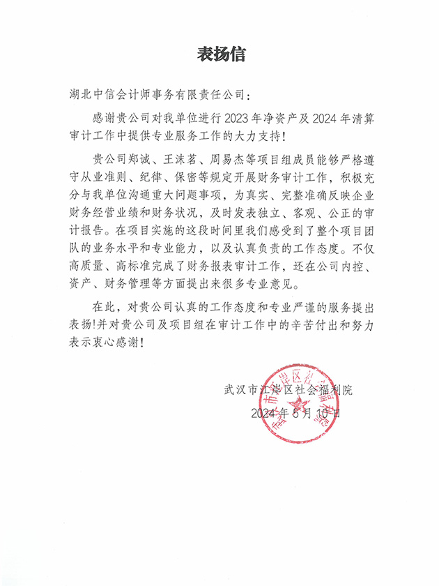 武漢是江岸區(qū)社會(huì)福利院表?yè)P(yáng)信