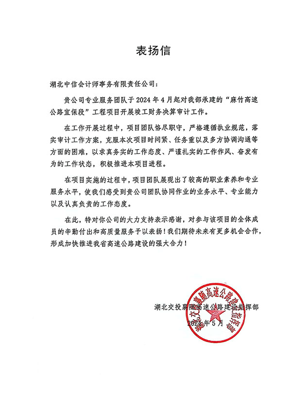 湖北交投襄隨高速公路建設(shè)指揮部感謝信