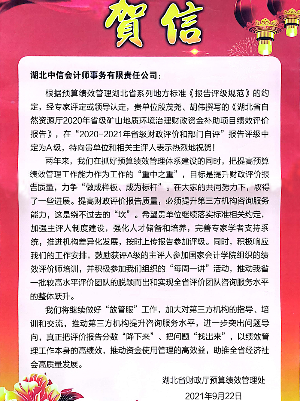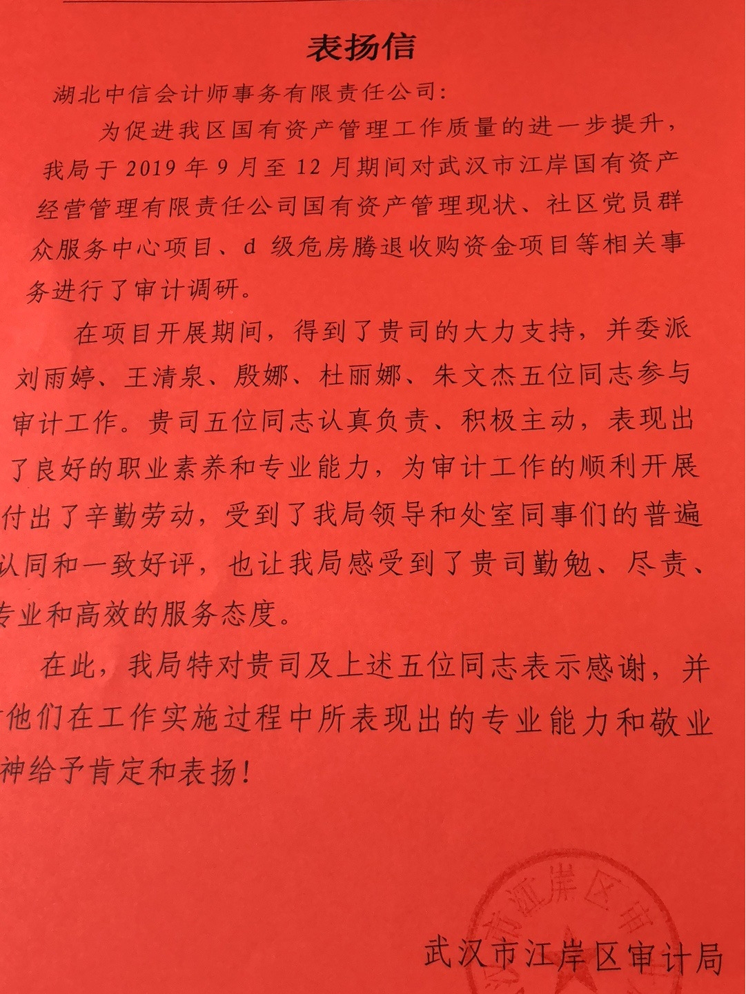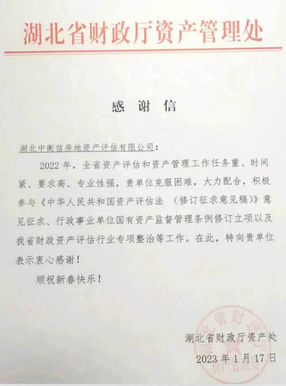 評估公司收到省財政廳資產(chǎn)處感謝信